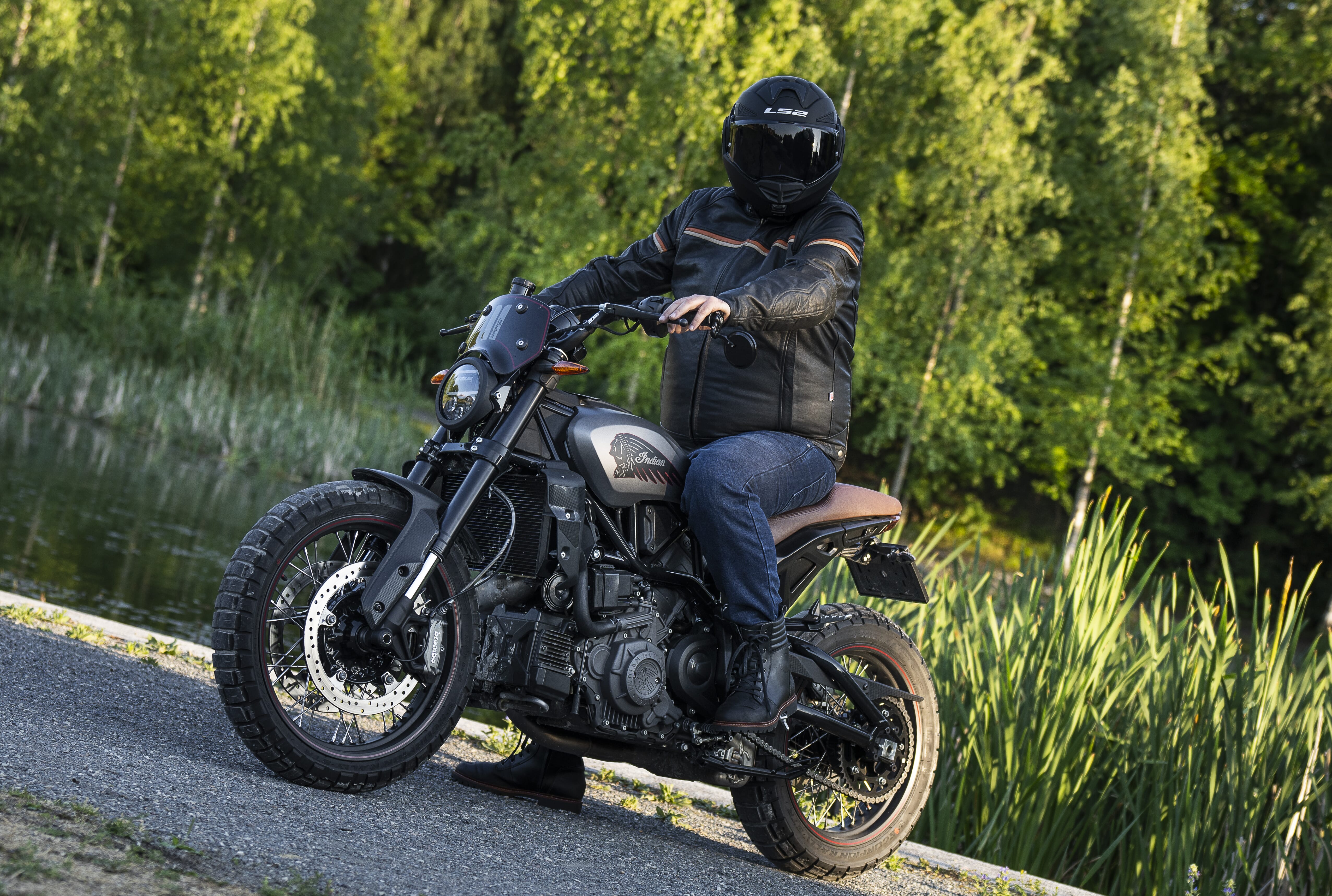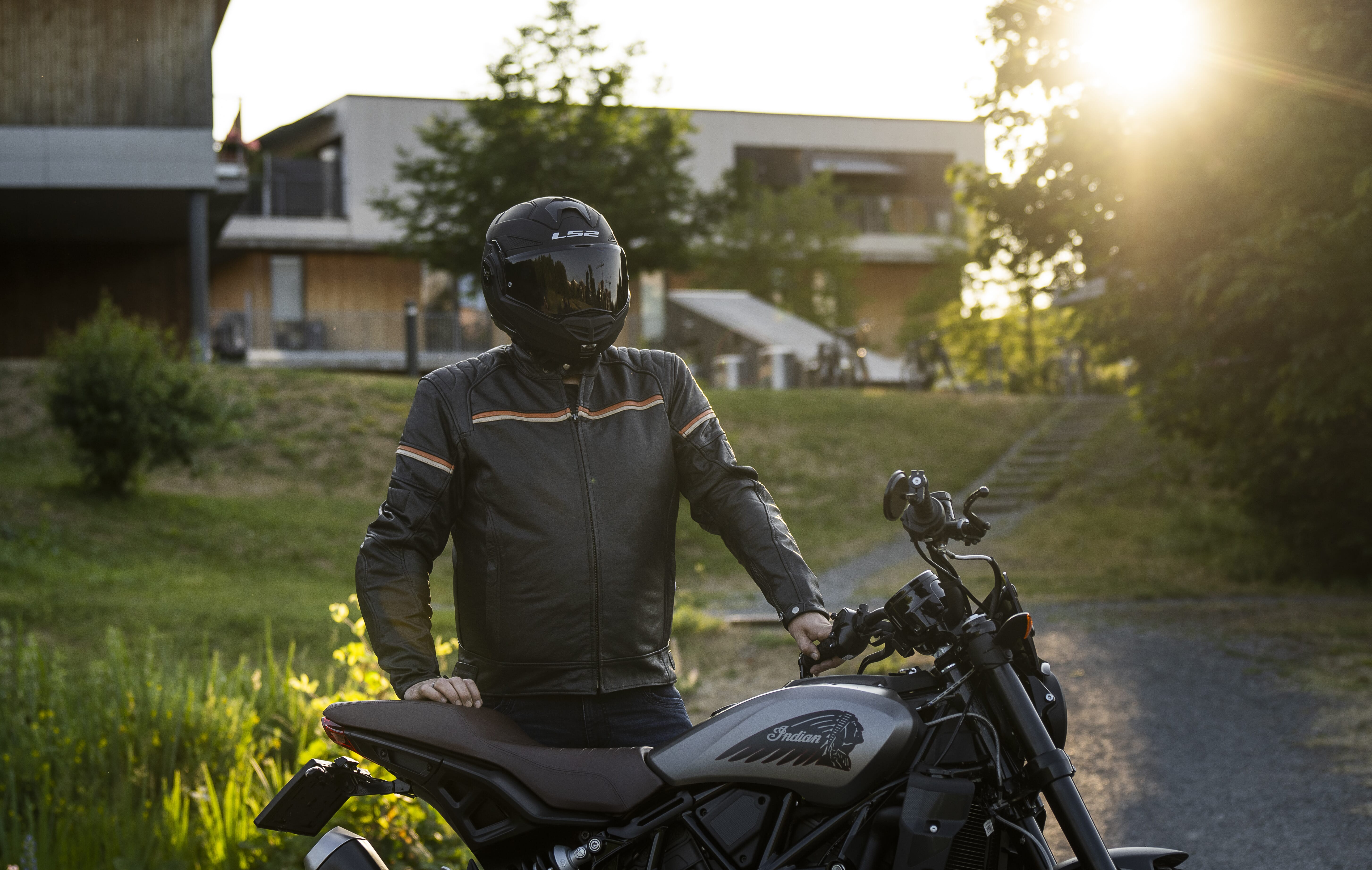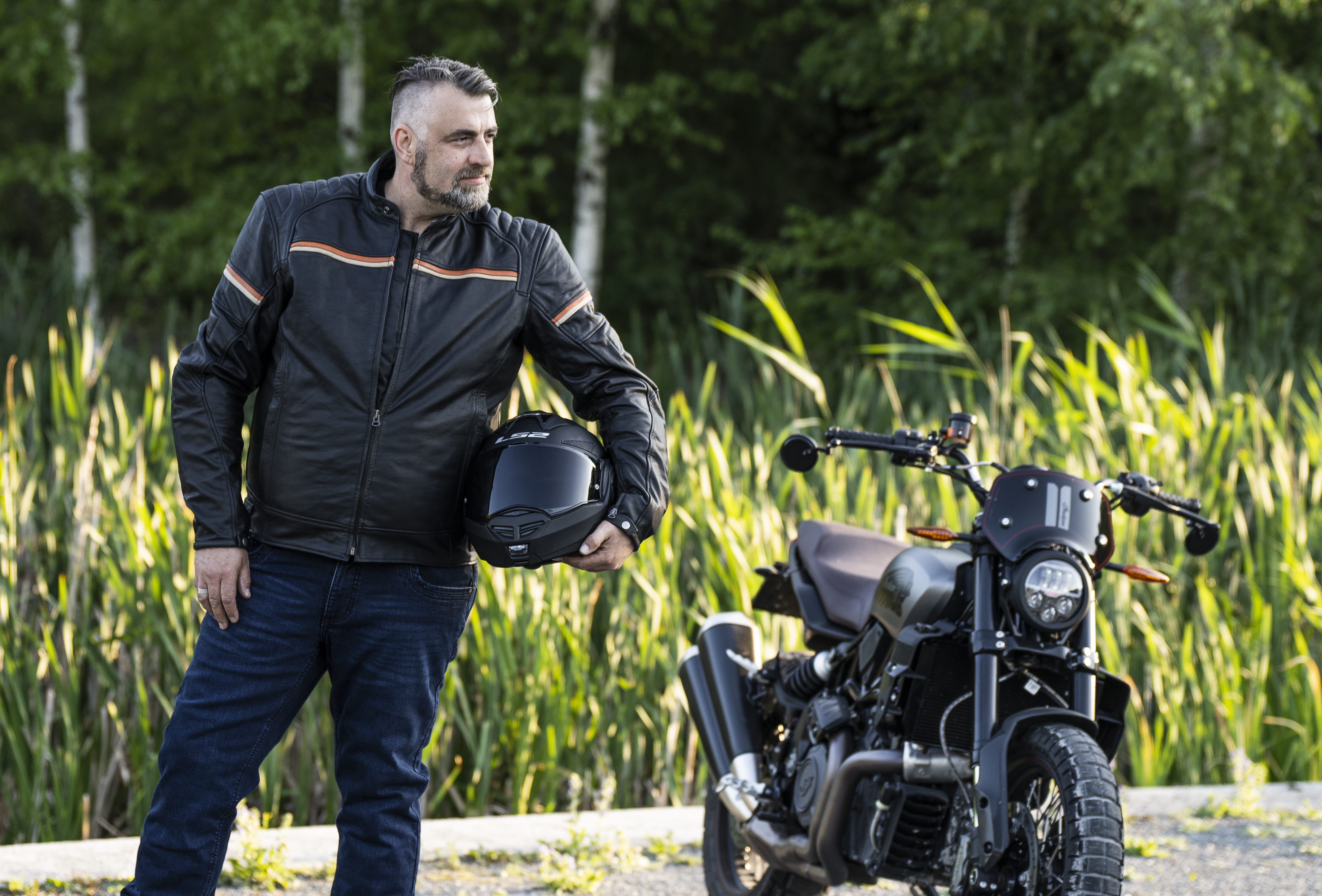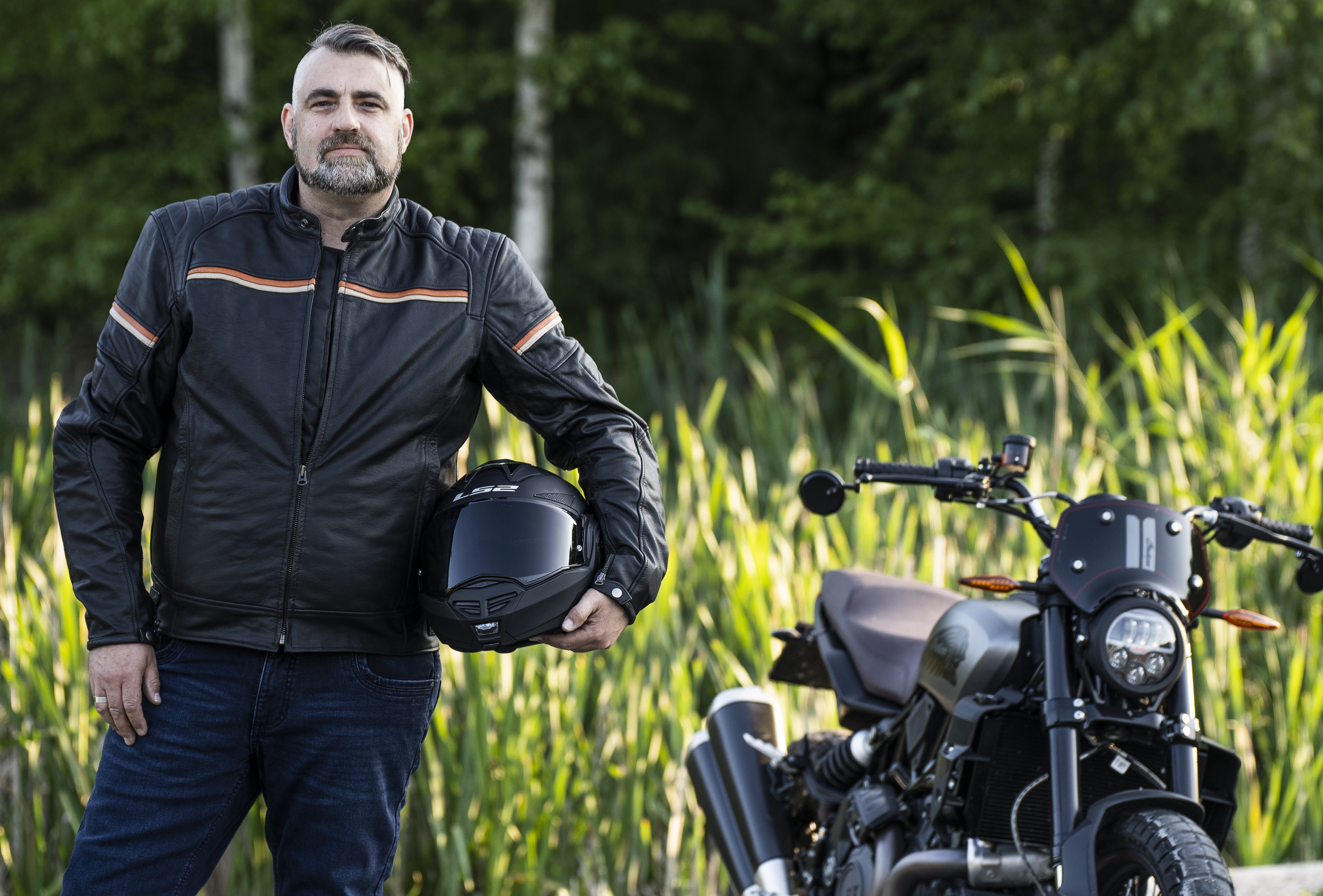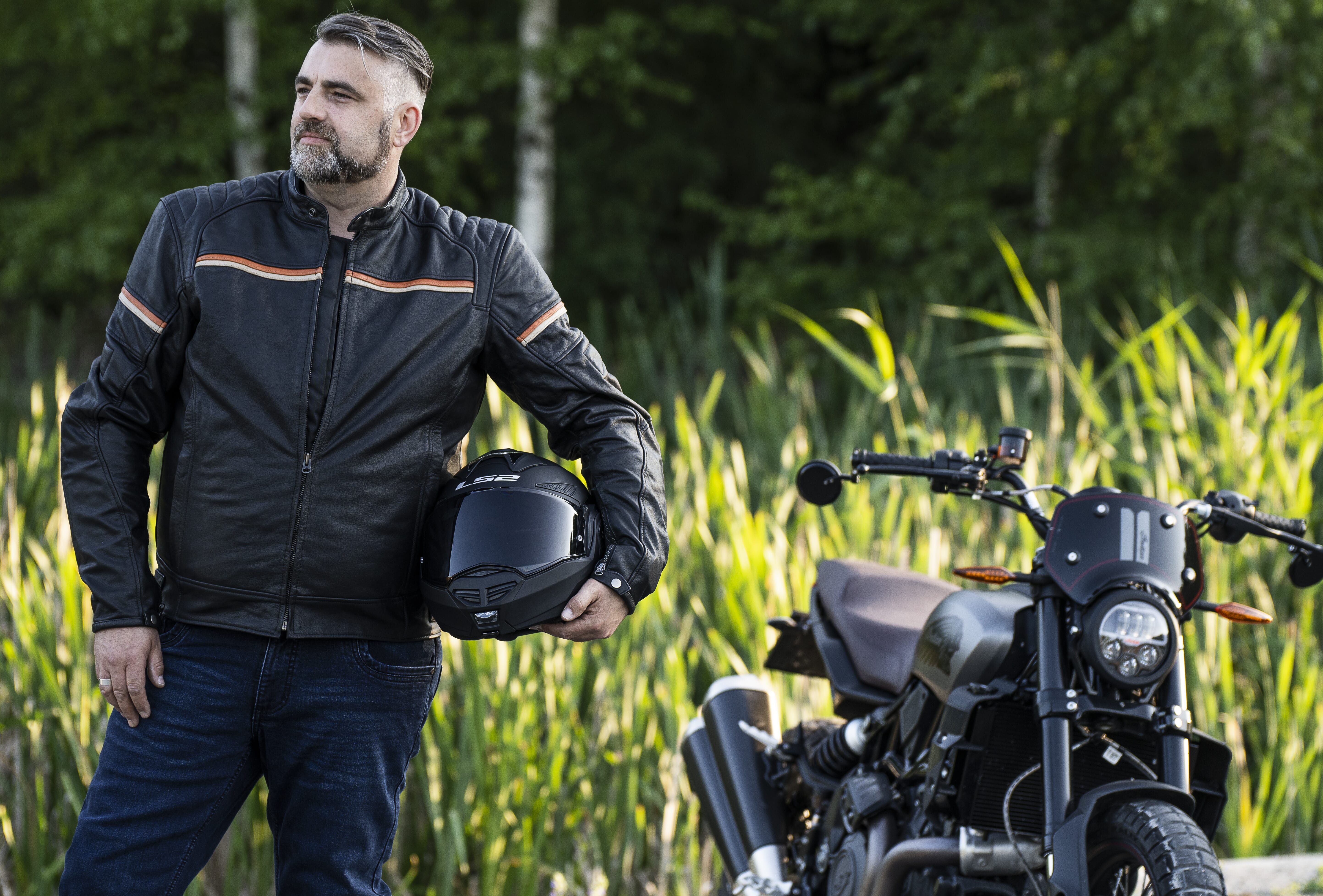 MC-jakke laget av geiteskinn med CE-godkjente beskyttelser.