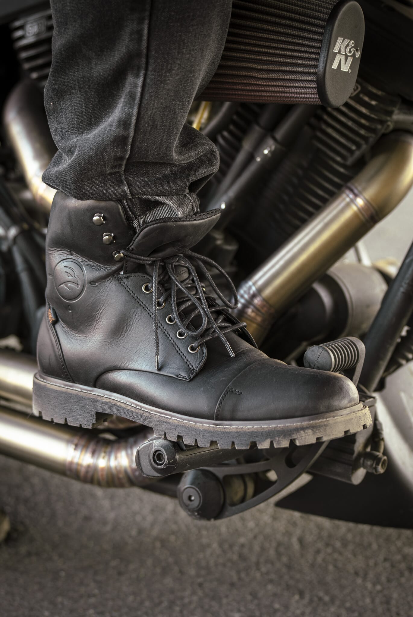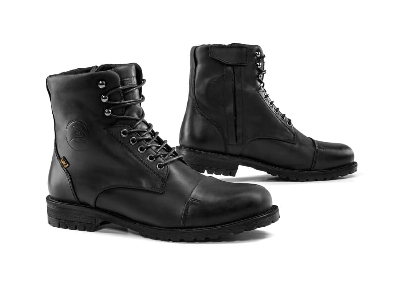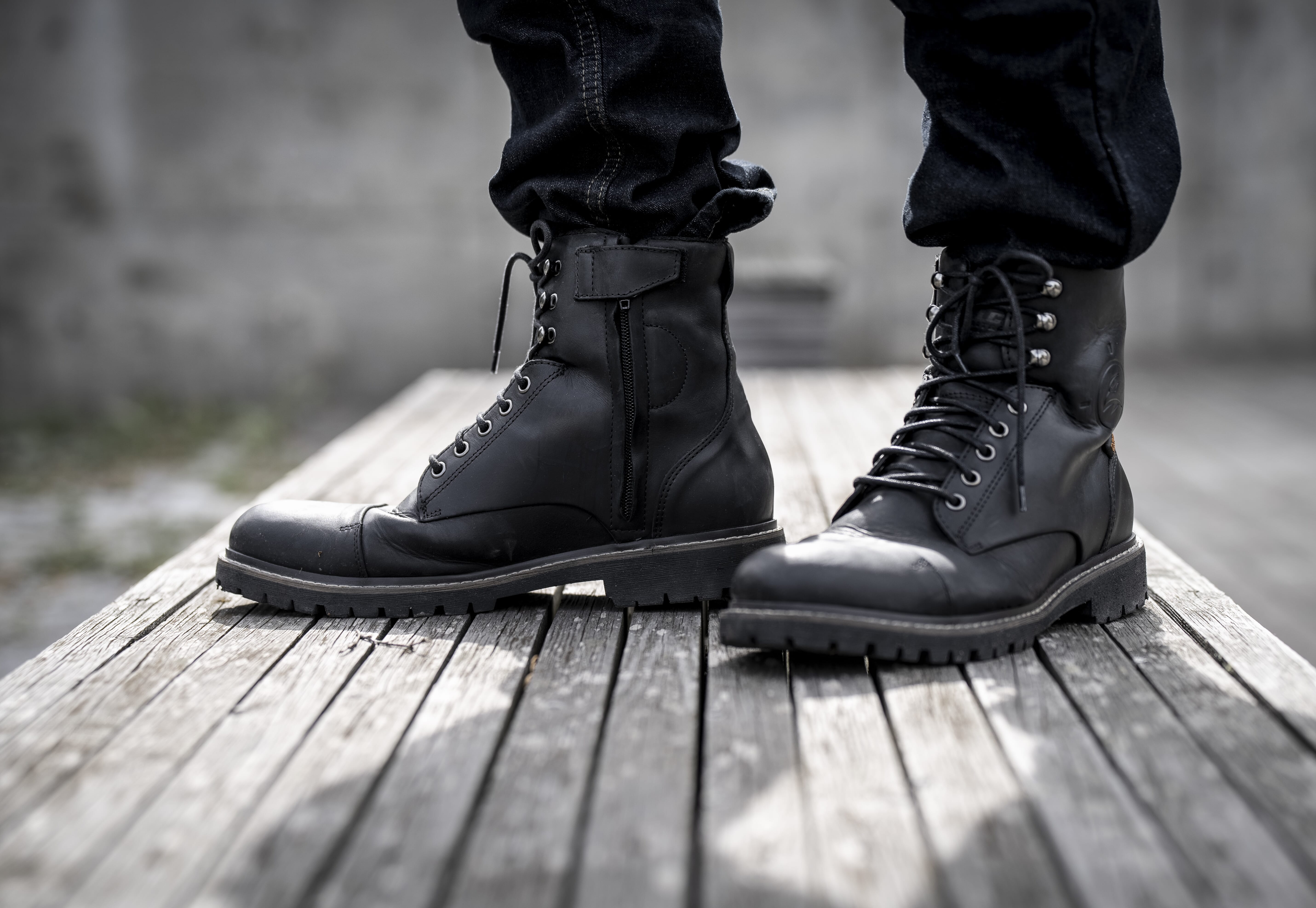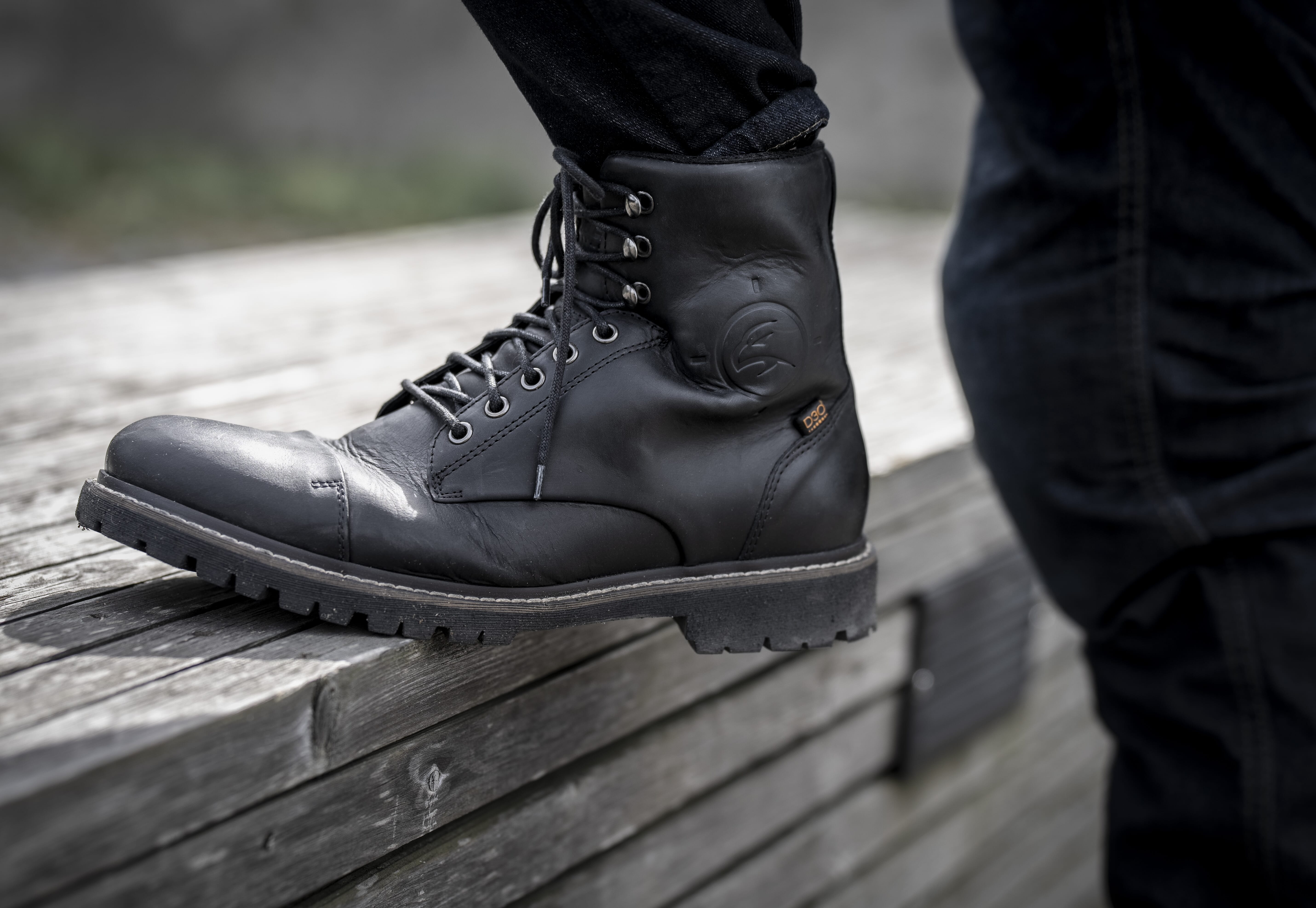 Oljebehandlet skinn og "High-Tex" membran. Forsterket tå og hæl. "D3O" ankelkoppinnsatser. Glidelås lukking. Med Slitesterk gummisåle.