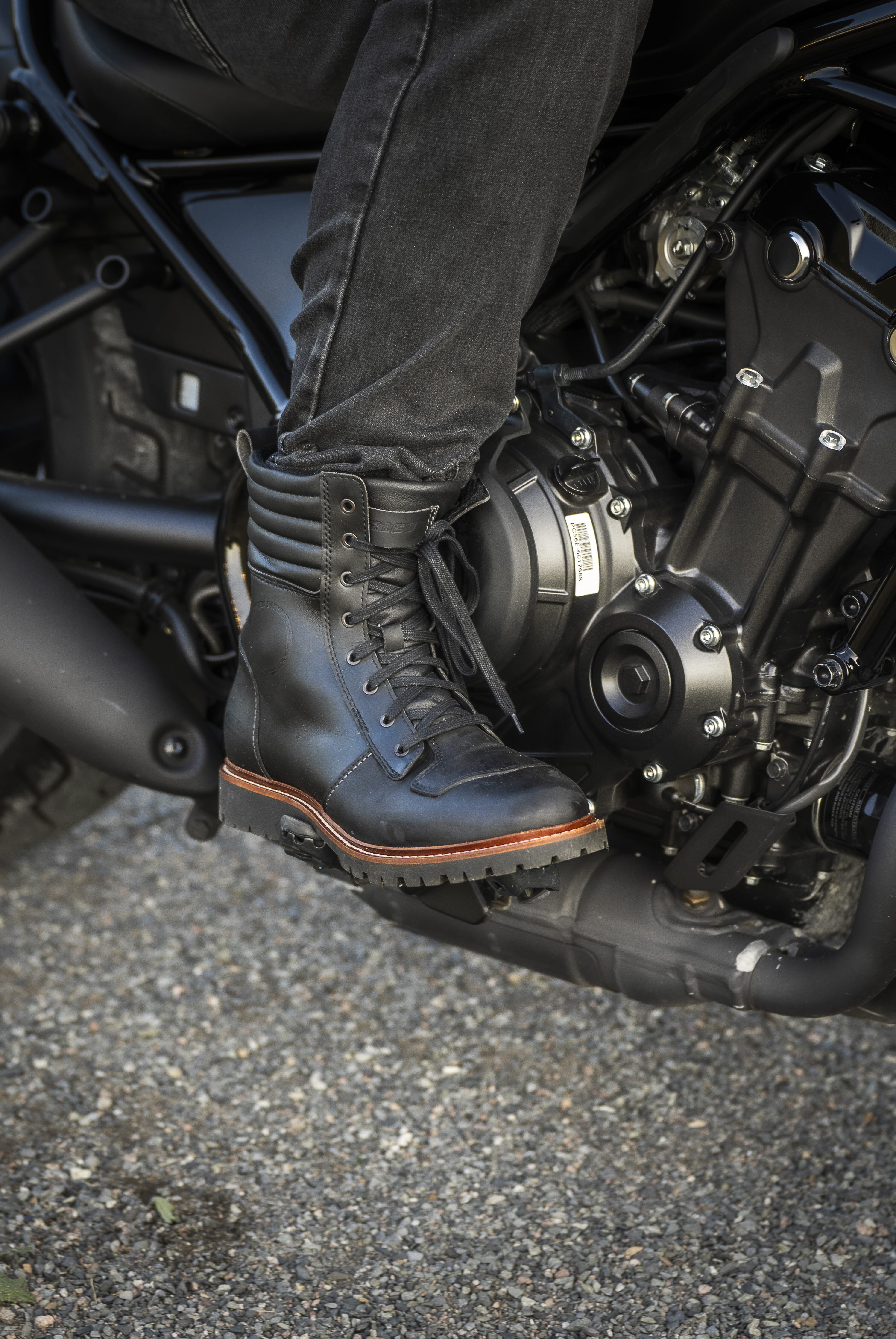 Oljebehandlet skinn og "High-Tex" membran. Forsterket tå og hæl. "D3O" ankelkoppinnsatser. Glidelås lukking. Med Slitesterk gummisåle.
