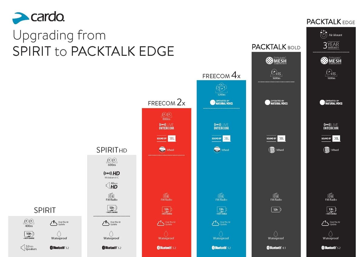 - Oppdatering: Over-the-air via Cardo-appen eller via USB