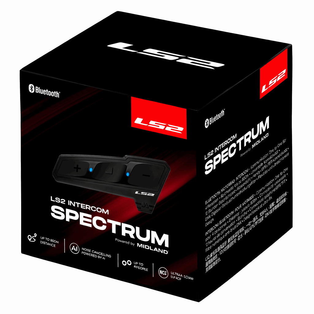 Intercom LS2 Spectrum er et avansert Bluetooth-kommunikasjonssystem utviklet spesielt for motorsykkelhjelmer i samarbeid mellom LS2 og Midland. Det gir deg trådløs, høy-kvalitets kommunikasjon, lyd og tilkobling på veien – uten kompromisser.