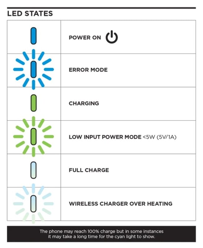 Hurtiglading (7,5W og 10W) krever 9v strømforsyning (ikke inkludert).